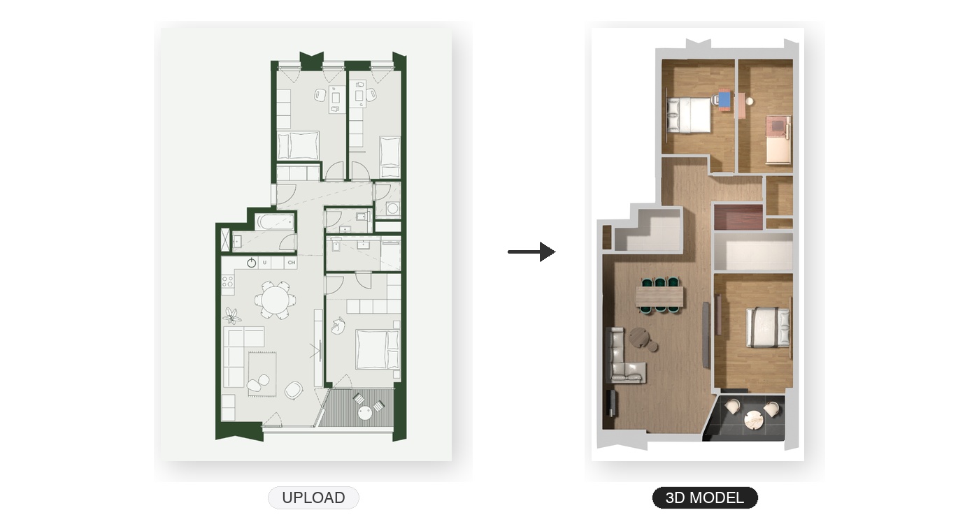 Upload any floor plan and the AI converts it into a furnished 3D model in seconds