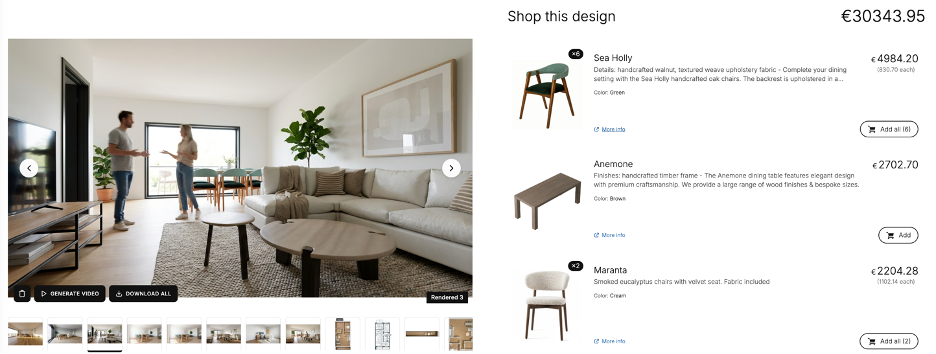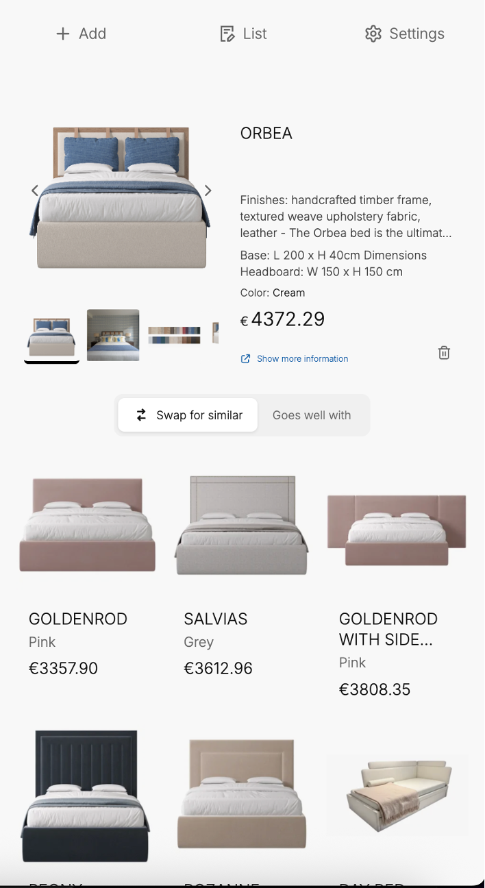 With tools like MeltFlex, you can browse real furniture from curated brands, see prices immediately, and use the “Swap for similar” button to cycle through alternatives. The ORBEA at €4,372, the GOLDENROD at €3,357, or the SALVIAS at €3,012 — each fits differently in the room, and you can see the difference instantly.