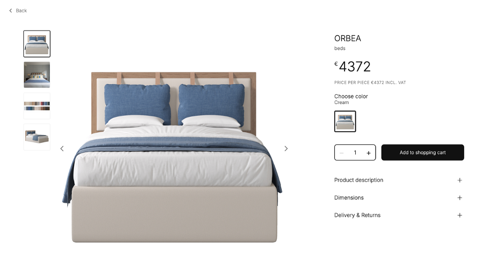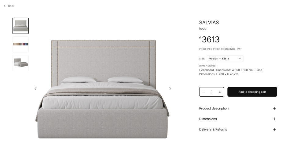 The ORBEA (€4,372) features a handcrafted timber frame with textured upholstery — a premium choice for daily use. The SALVIAS (€3,613) offers a clean, minimalist design at a lower price point with detailed dimensions (W 150 × H 150 cm headboard, L 205 × H 40 cm base) so you know exactly what you're getting. Both show product descriptions, dimensions, and delivery information upfront —browse the full catalog to compare options at every budget level.