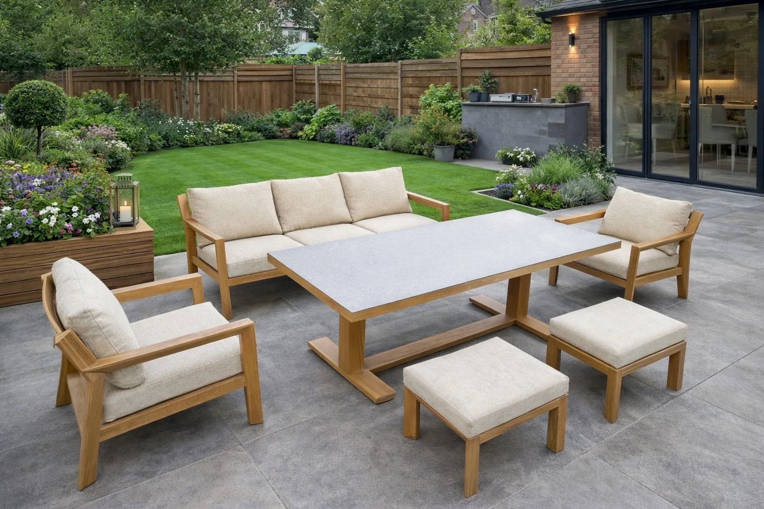 Natural teak wood with cream cushions. A three-seater sofa, two armchairs, footstools, and a stone-top coffee table. This is the style that works in any garden because the warm wood and neutral fabric complement rather than compete with the greenery around it.
