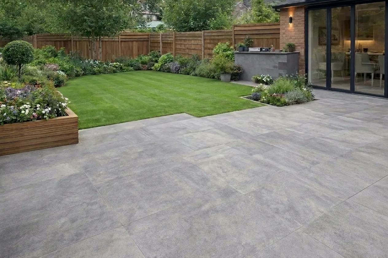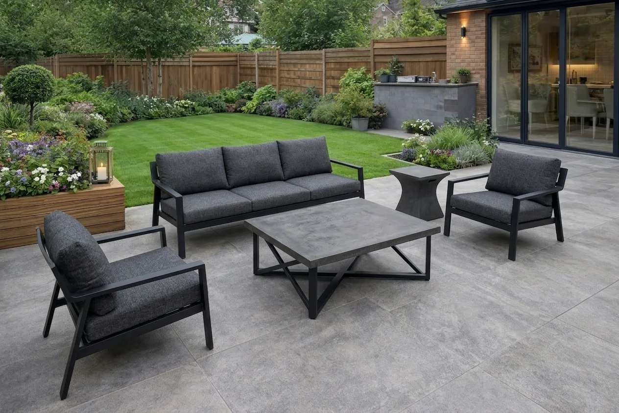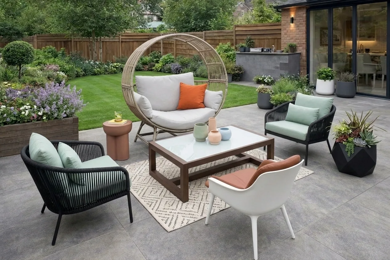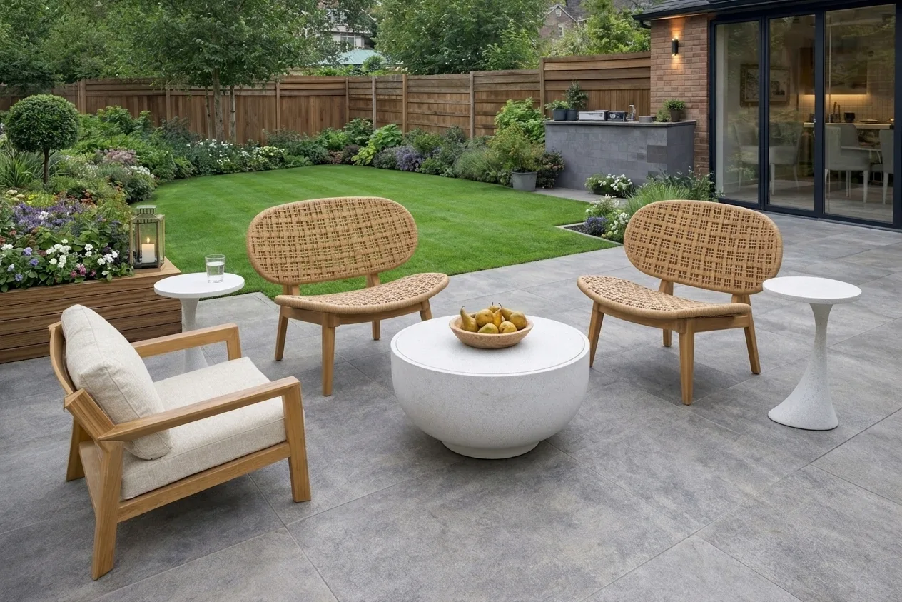 The best way to understand AI garden furniture design is to see it in action. We started with a single photo of a real patio — a modern home with grey stone tiles, a green lawn, raised planter beds, and glass sliding doors leading inside.