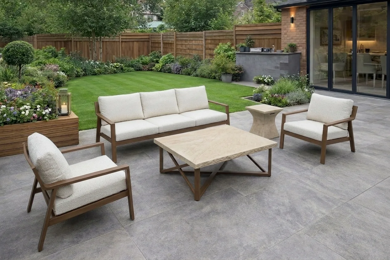 The biggest shift in outdoor furniture is away from cold, industrial materials toward warm natural ones. Teak, acacia, and eucalyptus wood paired with stone and concrete. Cushions in cream, sand, and warm grey rather than stark white. Design 1 and Design 8 above capture this perfectly.
