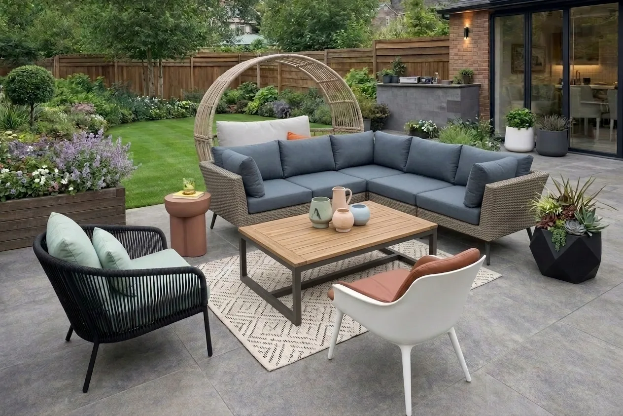 A generous L-shaped corner sofa with a statement egg chair. The outdoor rug anchors the space and the mix of grey upholstery with green accent cushions pulls colors directly from the garden. This is the kind of layout that turns a patio into a destination.