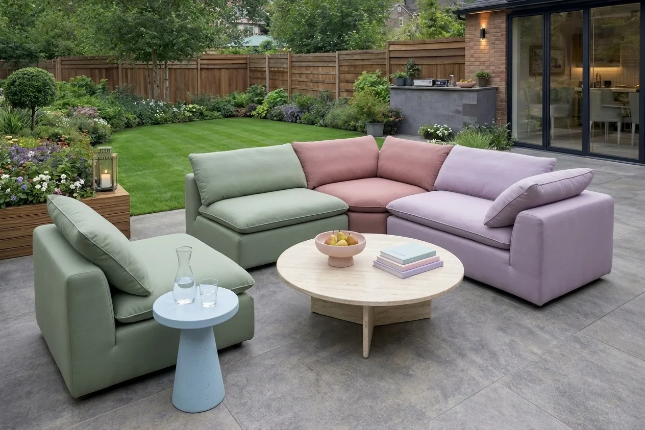 Bold color choice for an outdoor space. Sage green, blush pink, and lavender modular sofa pieces with a round oak coffee table. This is the 2026 trend of bringing indoor color confidence outdoors. The pastel palette softens the grey stone and creates a playful contrast with the lawn.