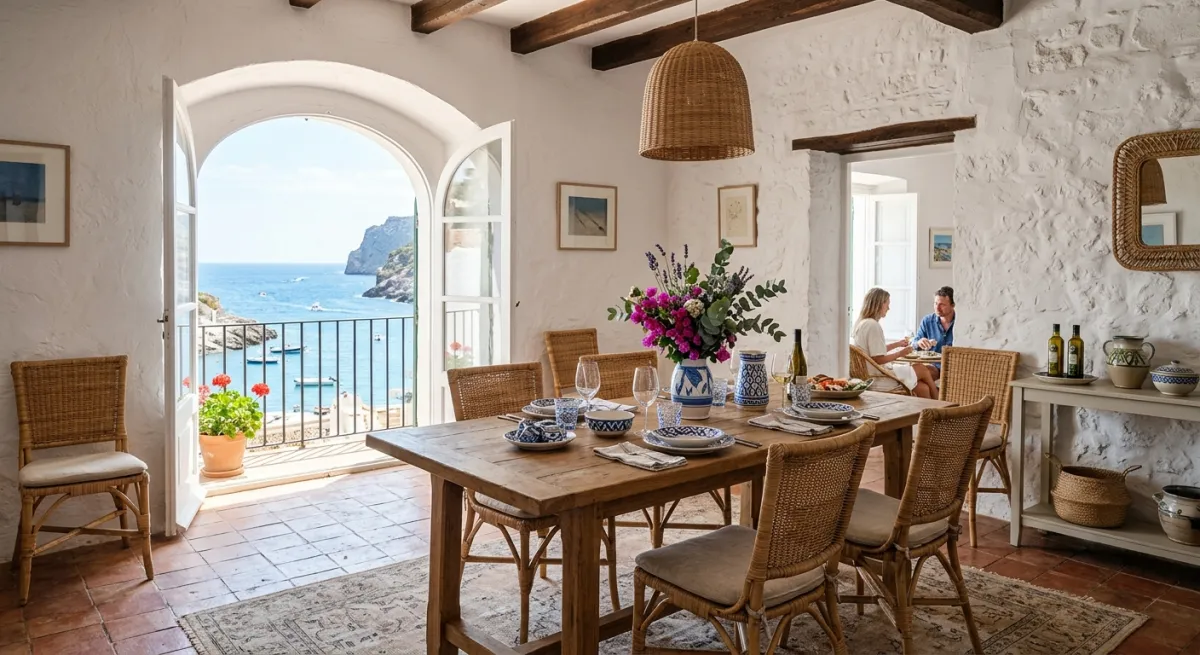 Mediterranean interiors draw from coastal regions of Greece, Italy, Spain, and Morocco. Signature elements: whitewashed plaster walls (historically lime-based for cooling), terracotta or stone floors, arched doorways and windows, and a blue-white color palette inspired by sea and sky. Natural materials dominate: rattan, wicker, olive wood, linen, and ceramic. Average Mediterranean dining table seats 6–8 people — communal dining is central to the culture.