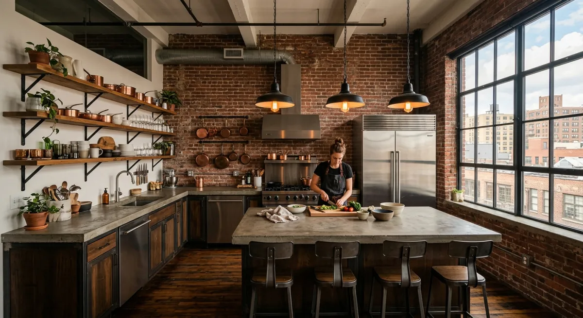 The prompt: “Industrial style loft kitchen with exposed red brick walls, black metal pendant lights, concrete countertops, open shelving, and large factory windows.”