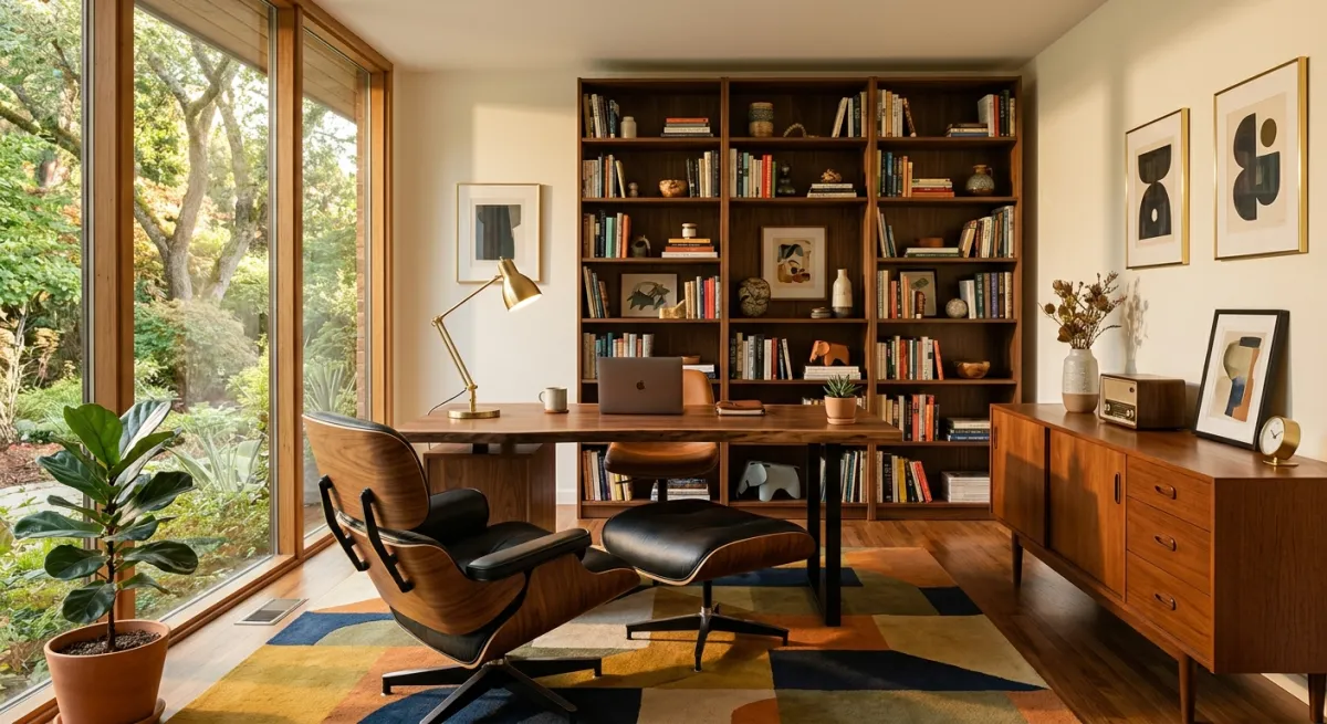 The prompt: “Mid-century modern home office with a walnut wood desk, Eames-style chair, geometric patterned rug, brass desk lamp, and floor-to-ceiling bookshelf.”