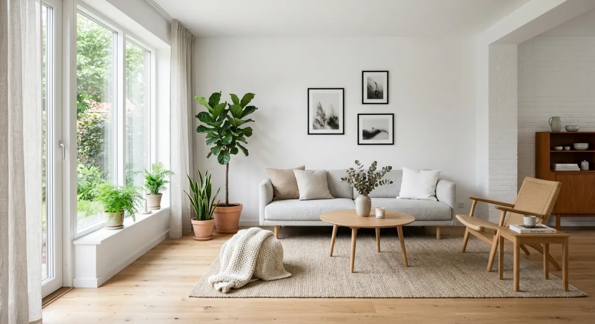 Scandinavian design originated in the 1950s across Denmark, Sweden, Norway, and Finland. The core principle is funktionalism — every object must serve a purpose. Typical material palette: light oak, birch, pine, wool, linen. Color range: whites, soft grays, muted earth tones. Average room keeps 60–70% of surfaces white or near-white to maximize the limited Nordic daylight.