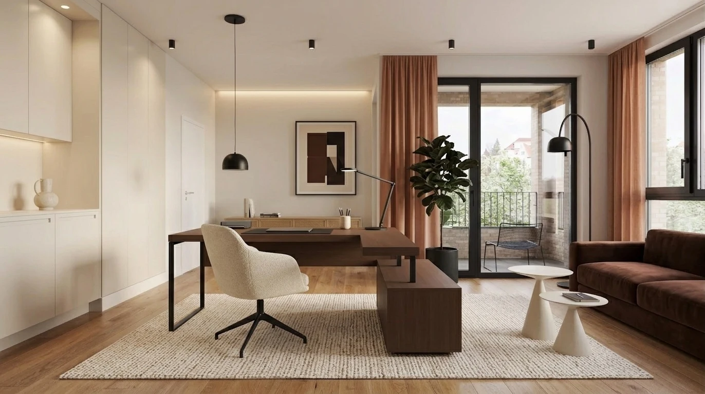 prompt: "Warm minimalist living room with oak furniture, linen sofa, wool rug, and brass accents",