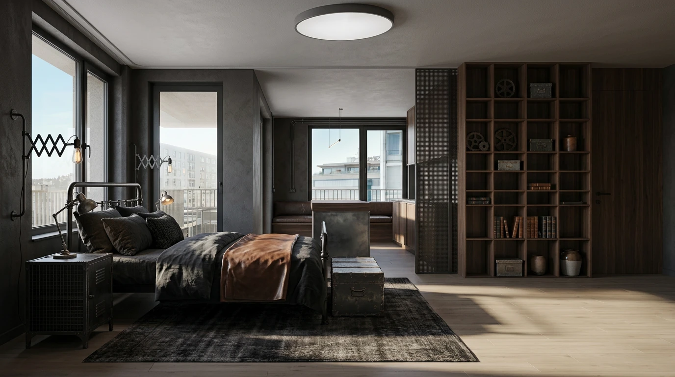 Redesign as an industrial bedroom with a dark iron bed frame, charcoal bedding with a burnt orange throw, exposed brick accent wall, dark wood built-in shelving, an adjustable wall-mounted reading lamp, and a worn leather ottoman at the foot of the bed. Moody low evening light. Raw, bold, masculine.