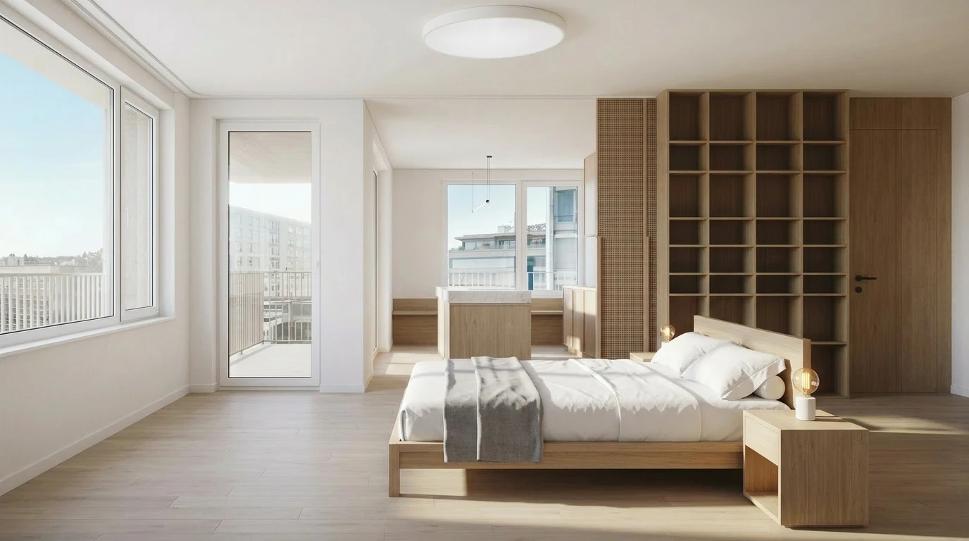 Stage this empty studio apartment to maximize perceived space. Place a compact two-seater sofa, a multifunctional dining table that doubles as a desk, a folding bookshelf, a queen platform bed with storage drawers in the sleeping zone, and a large mirror on one wall. Bright daylight throughout. Smart, spacious-feeling, practical.