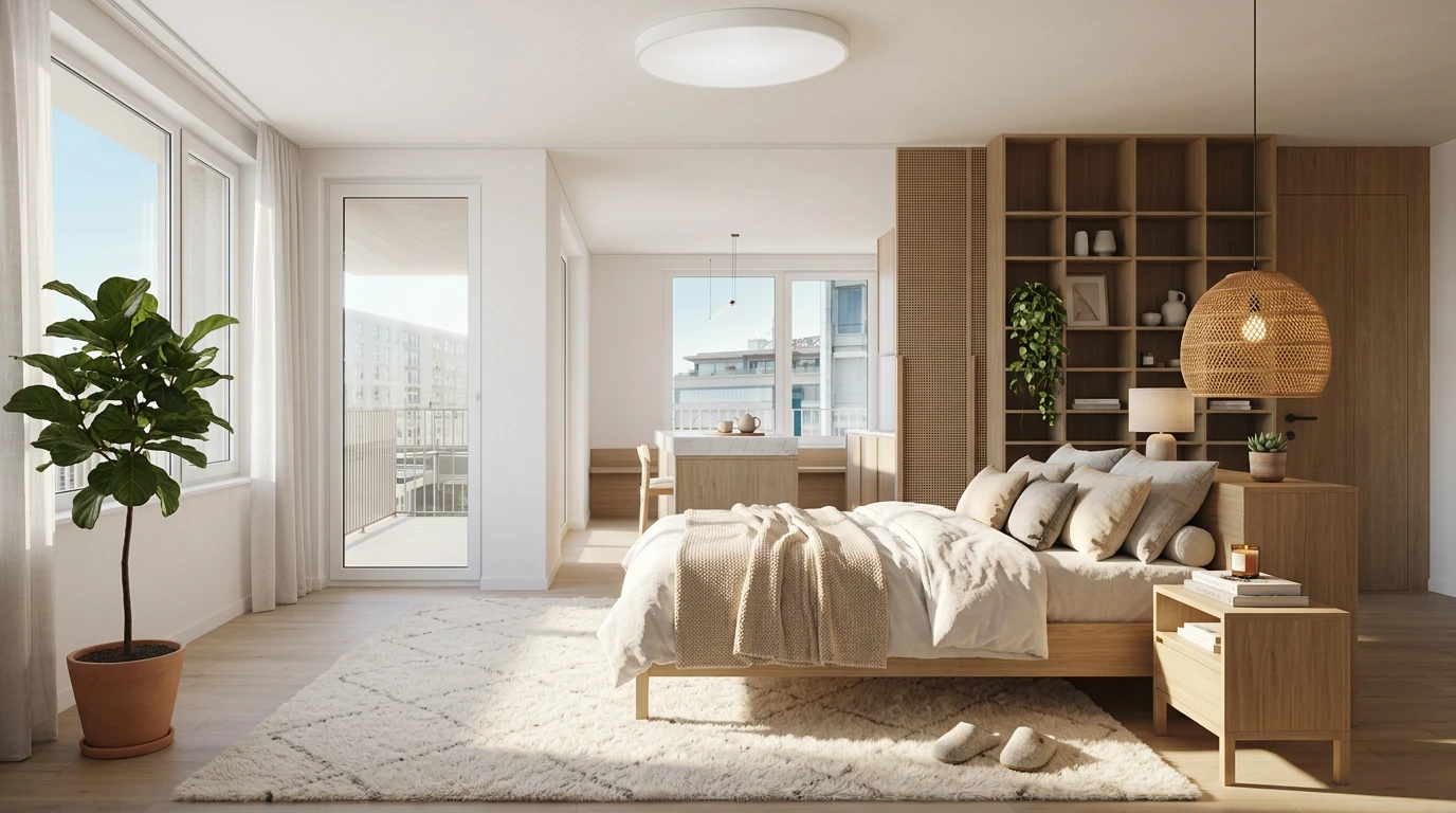 Redesign this studio apartment with a sofa bed in light grey, a tall open bookshelf as a room divider between sleeping and living zones, a fold-down wall desk, a small two-person dining table, white walls with a gallery wall of framed prints, and warm pendant lighting. Bright and airy. Functional, smart, inviting.