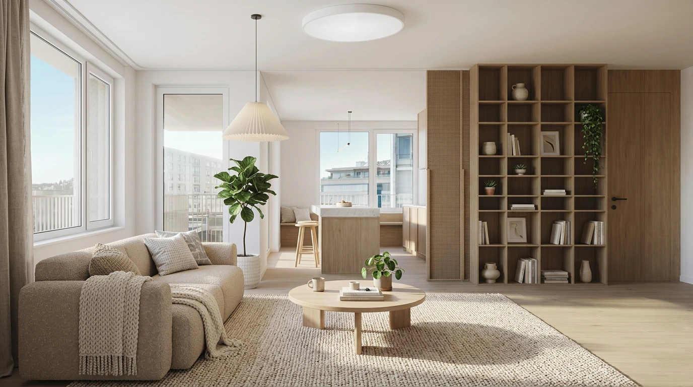 Strong prompt: "Redesign as a Japandi living room with a low-profile linen sofa in warm beige, a walnut coffee table, white limewash plaster walls, woven jute rug, and one large olive tree in a matte ceramic pot. Soft diffused afternoon light from the left window. Calm and grounded."