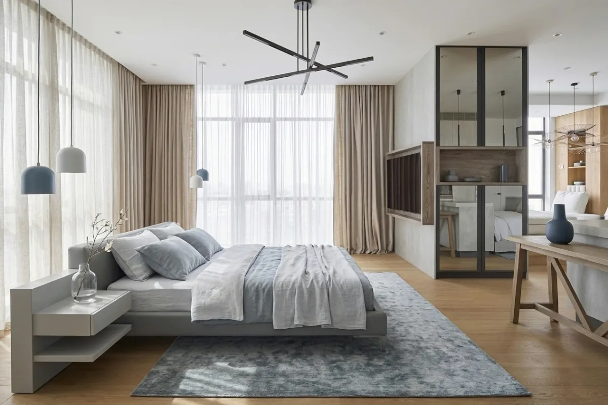The AI generated bedroom features a low platform bed in warm grey with linen bedding in soft blue and white. A grey blue area rug grounds the sleeping area, and pendant lights in slate blue hang on either side instead of traditional table lamps. The modern chandelier overhead adds a contemporary touch that keeps the room from feeling too country.