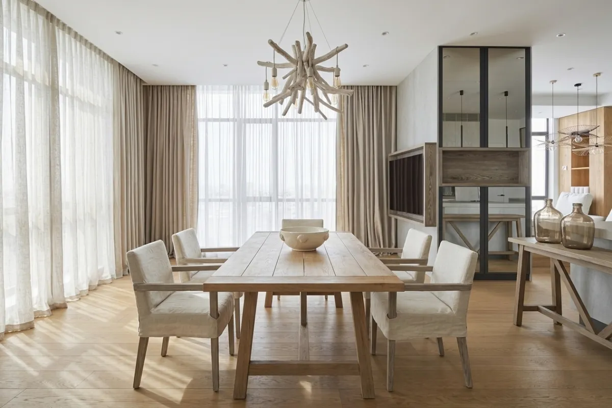 The AI redesigned the dining area with a solid reclaimed wood table, upholstered dining chairs in natural linen, and a statement driftwood chandelier that immediately sets the farmhouse tone. The table has visible wood grain and a slightly weathered finish that gives it the character of an heirloom piece.