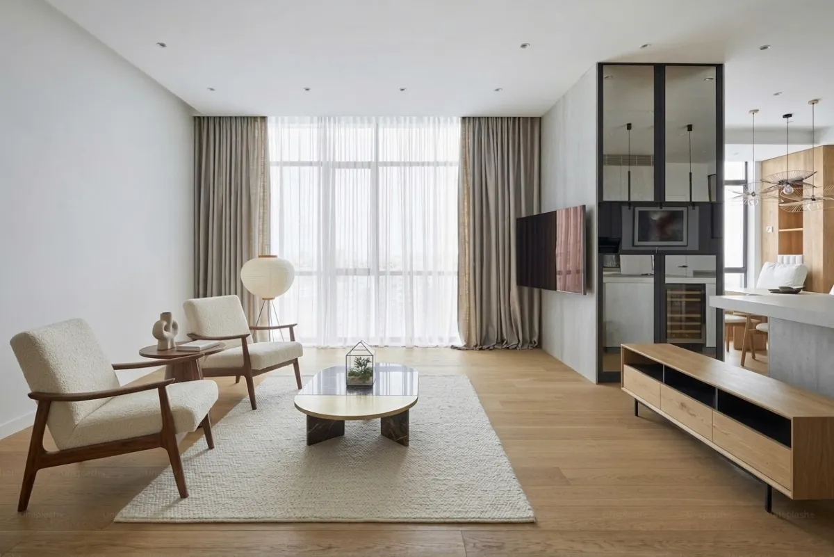 A different take on the same room uses mid century influenced chairs with warm walnut frames and bouclé upholstery, paired with a low round coffee table and a minimalist TV console. This leans toward what designers call transitional farmhouse where mid century shapes meet rustic warmth.