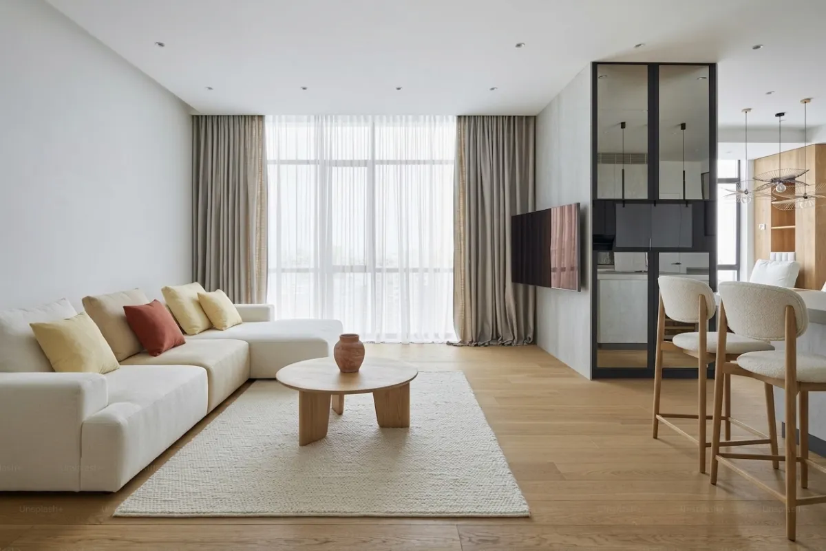 For context, here is the original apartment before any AI redesign. A clean, modern space with a beige sectional and minimal styling. Nice but lacks the warmth and character that farmhouse brings.