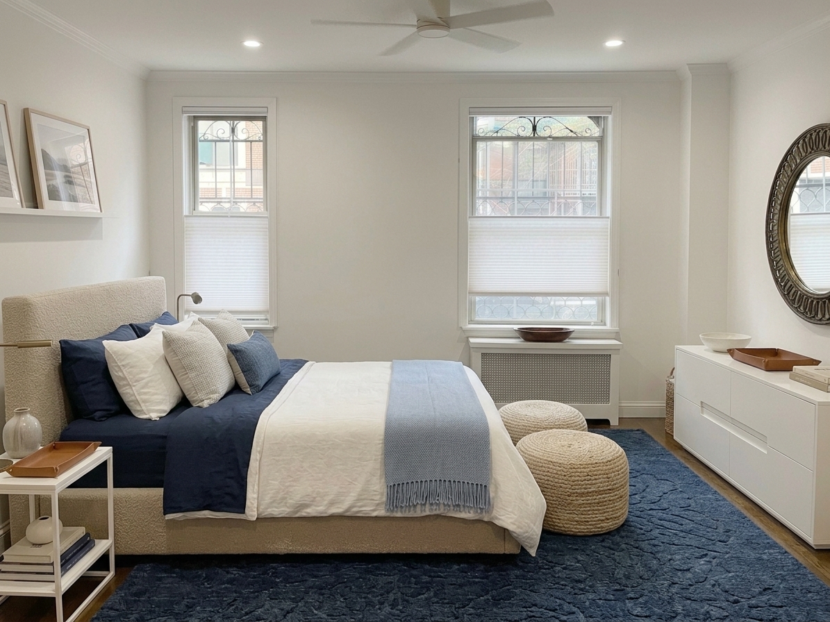 Coastal bedroom: Upholstered bed frame ($299), navy duvet set ($49), woven poufs ($35 each), blue area rug ($89), white dresser ($179), wooden nightstand ($54). Total: approximately $740 for a complete bedroom from Amazon.