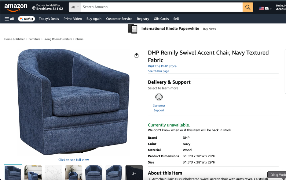 The navy swivel accent chair: found on Amazon for $54. The original designer version of a similar chair runs $300 to $500 at furniture stores. That is an 82 to 89% savings for a chair that looks nearly identical in the room.