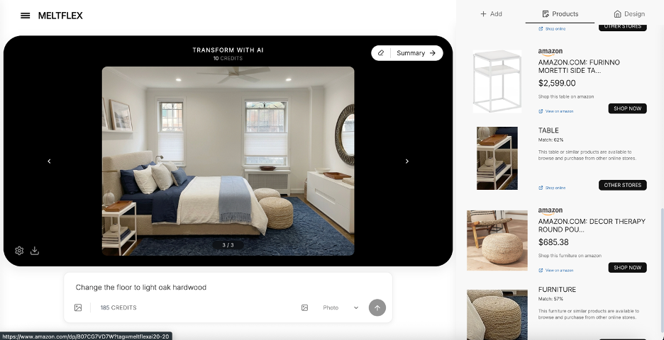 Here is a real example. We uploaded a photo of this room and MeltFlex detected every piece of furniture, from the bed frame and nightstand to the ceiling fan and accent chair. Each item shows an Amazon product card with price and a direct link to buy.