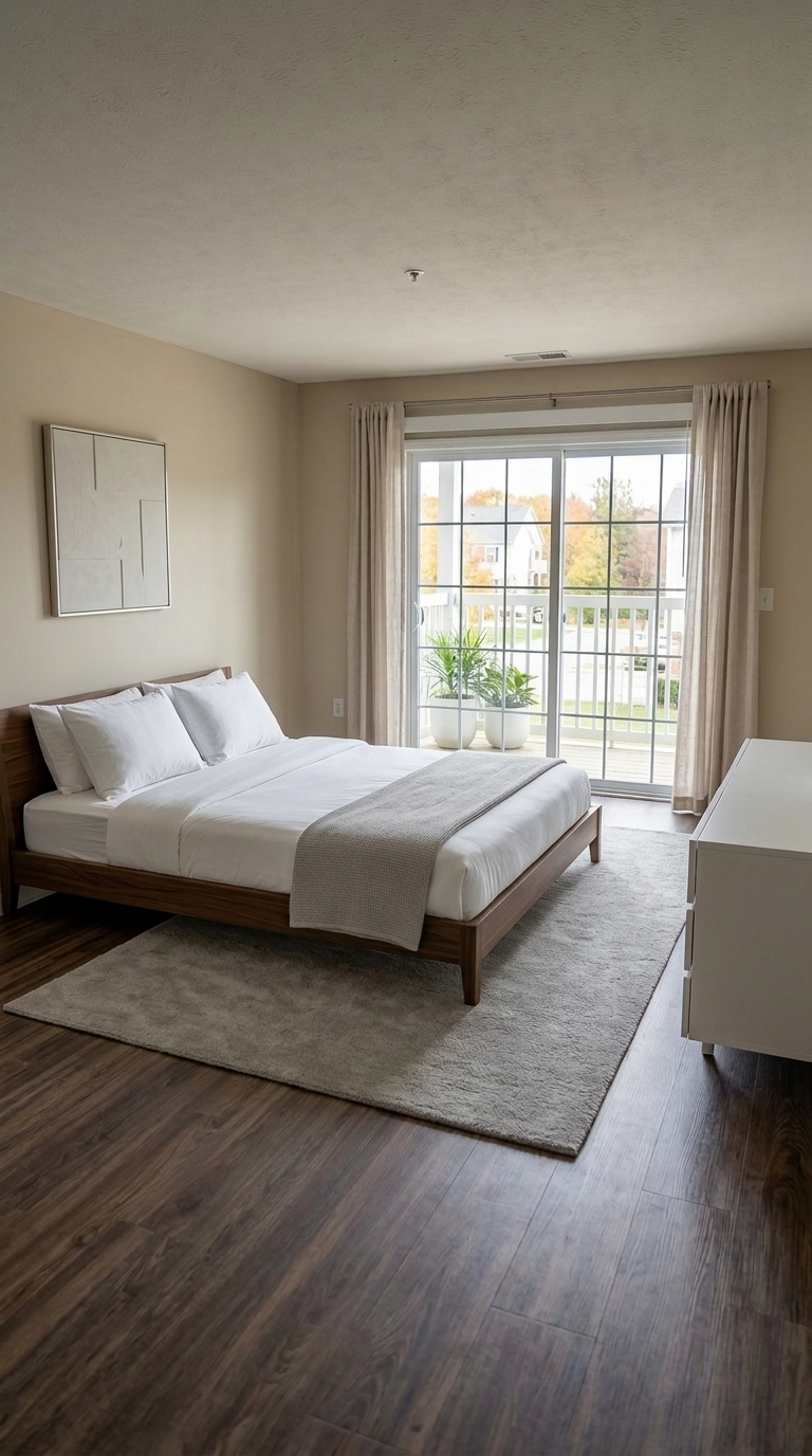 A walnut platform bed with crisp white bedding and a textured beige throw. A large grey area rug softens the dark floor. A white dresser for storage, minimal abstract art above the bed, and sheer curtains filtering the balcony light. Plants on the balcony visible through the glass add greenery without taking floor space. This room says: sleep well.