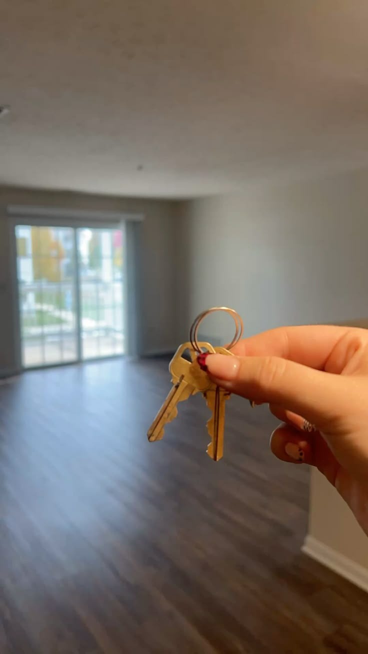 This is the moment everyone knows — you just picked up the keys, you are standing in an empty apartment, and the enormity of furnishing it hits you. Dark wood floors, bare white walls, a sliding door to the balcony, and absolutely nothing else.