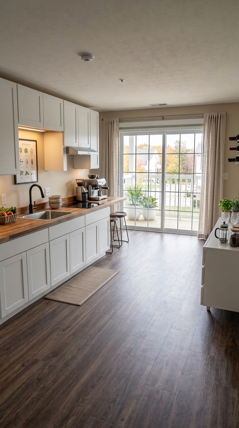 The empty kitchen space transformed into a fully equipped cooking zone: white shaker cabinets with walnut butcher-block countertops, under-cabinet lighting, a matte black faucet, and open shelving for herbs and cookbooks. Two metal-frame bar stools at the counter create an informal eating area. A coffee station, fruit basket, and potted herbs make it feel immediately livable.