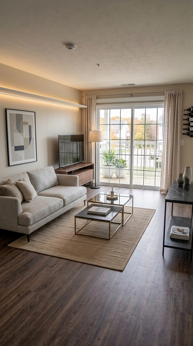 A light grey sofa with clean lines anchors the room. A jute area rug defines the seating zone on the dark floor. A glass-and-gold coffee table, walnut TV console, and linen curtains framing the balcony door. Indirect LED strip lighting along the ceiling edge adds warmth in the evening. Abstract art on the wall and a tall plant by the door — done.