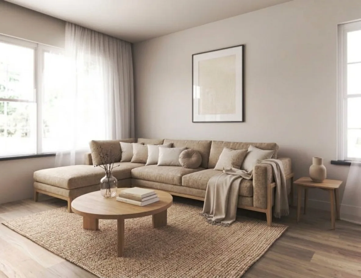 This is the design that gets 50,000 saves on Pinterest. A beige L-shaped sectional anchors the room. Round oak coffee table. Jute rug stretching wall to wall. One framed abstract print. A single dried branch arrangement in a ceramic vase. The room feels expensive but costs under $3,500 in total.