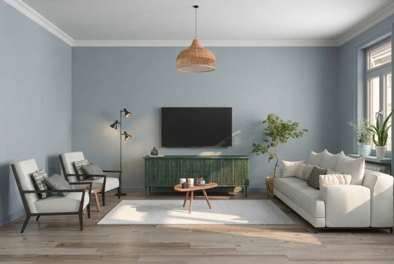 Blue-grey is the safe-but-stylish option. It adds color without drama, feels modern and fresh, and works with almost any furniture style. The cool wall tone pairs beautifully with the warm wood floor — the contrast between warm and cool creates visual interest.
