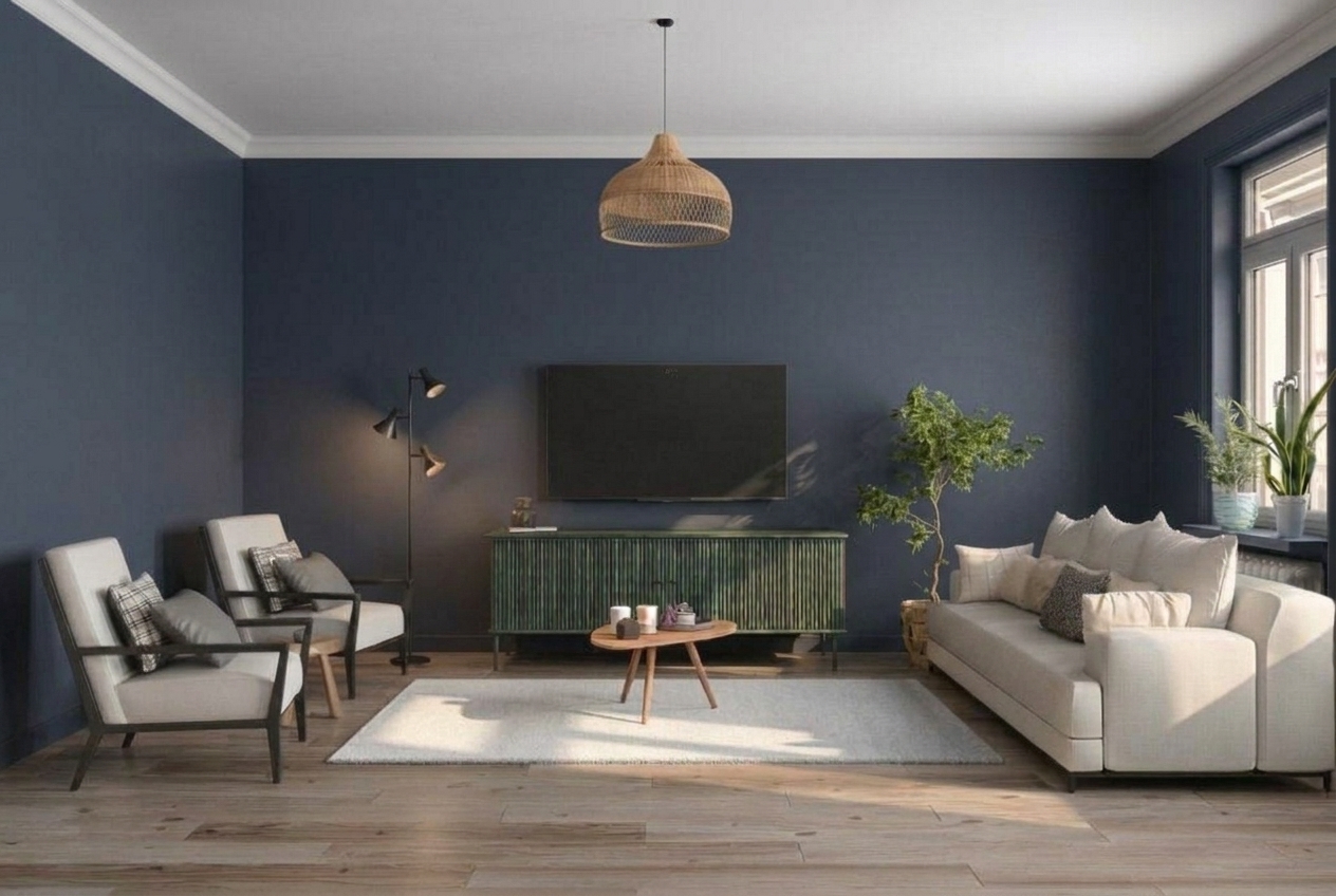 For example: warm white walls (60%) + a slate blue sofa with blue-grey curtains (30%) + mustard yellow cushions and a brass lamp (10%). The room feels balanced because no single color overwhelms.