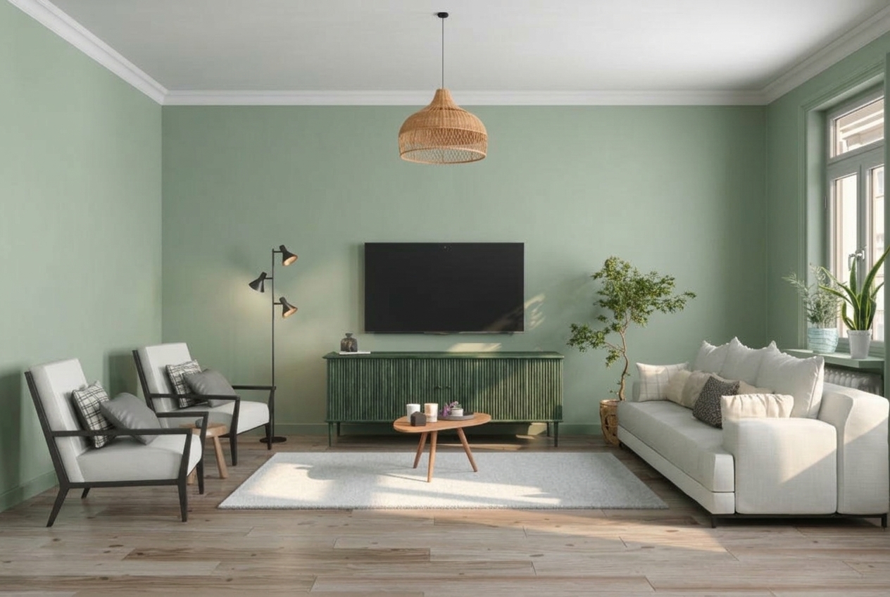Sage green transforms the room into something organic and calming. The green TV console blends into the wall instead of standing out, creating a more unified look. The warm oak floor and rattan pendant balance the cool green perfectly.
