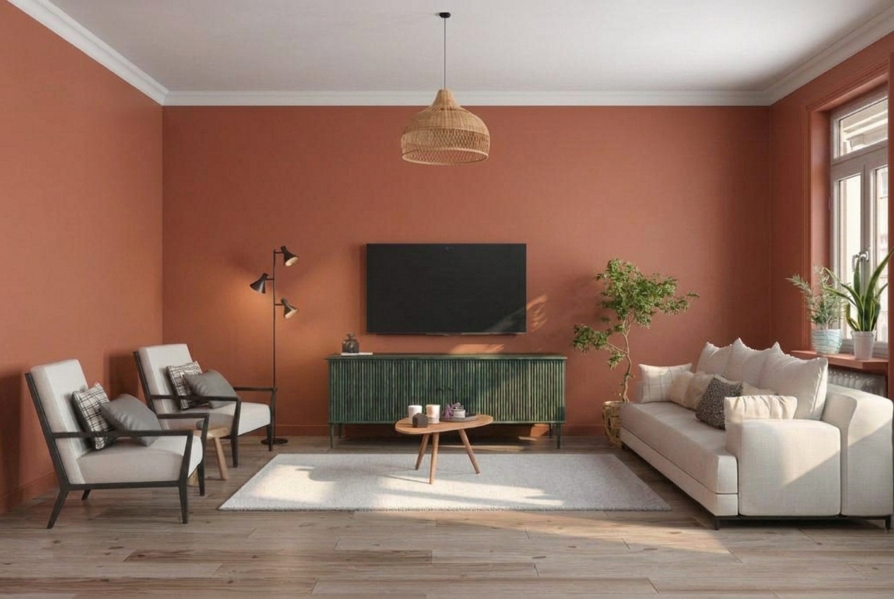 Terracotta brings immediate warmth. The room feels cozy and inviting — like a Mediterranean villa. The neutral sofa and warm oak floor complement the earthy wall color naturally. This is a bold choice that rewards commitment.