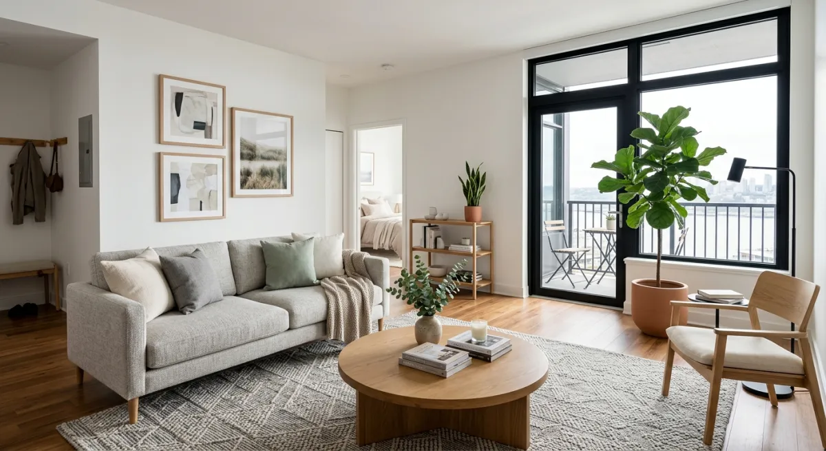 After: The same room, virtually staged in under 30 seconds. Scandinavian furniture, warm lighting, plants — the space now tells a story. Buyers can see themselves living here.