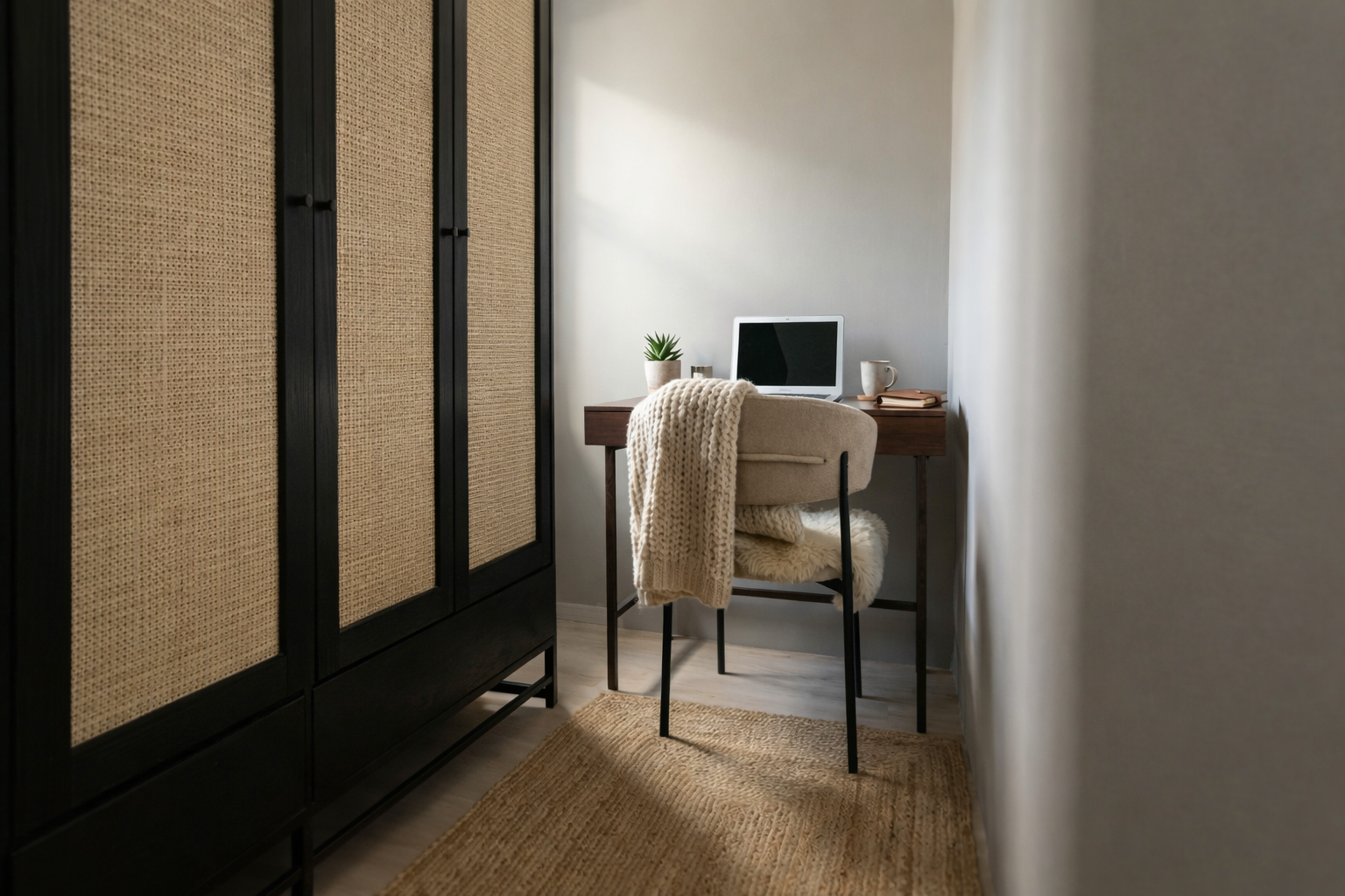 A fusion of Japanese minimalism and Scandinavian warmth. Low-profile furniture, natural materials (wood, linen, stone), a muted color palette, and intentional negative space. Japandi is designed around the idea that empty space is not wasted space — it is a design element. This philosophy is perfect for small rooms.