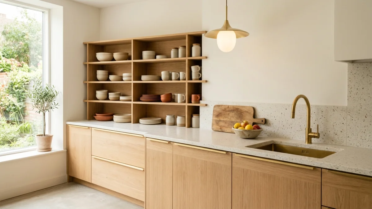 Natural oak cabinets with simple slab fronts are the foundation. Pair them with a stone or terrazzo countertop in a warm tone. Open shelves (one or two, not covering the entire wall) display a curated set of ceramic dishware. The countertop stays almost empty: a wooden cutting board, a ceramic bowl, and a plant. That’s it.