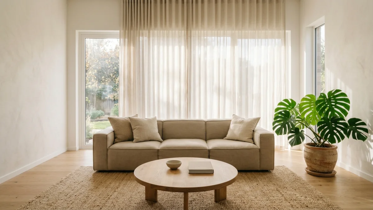 Start with a low profile sofa in a warm neutral fabric. Sand, oatmeal, or soft camel. Pair it with a round coffee table in natural wood because round shapes soften the space and feel less formal than sharp rectangles. Add a natural fiber rug (jute or sisal) to ground the seating area.